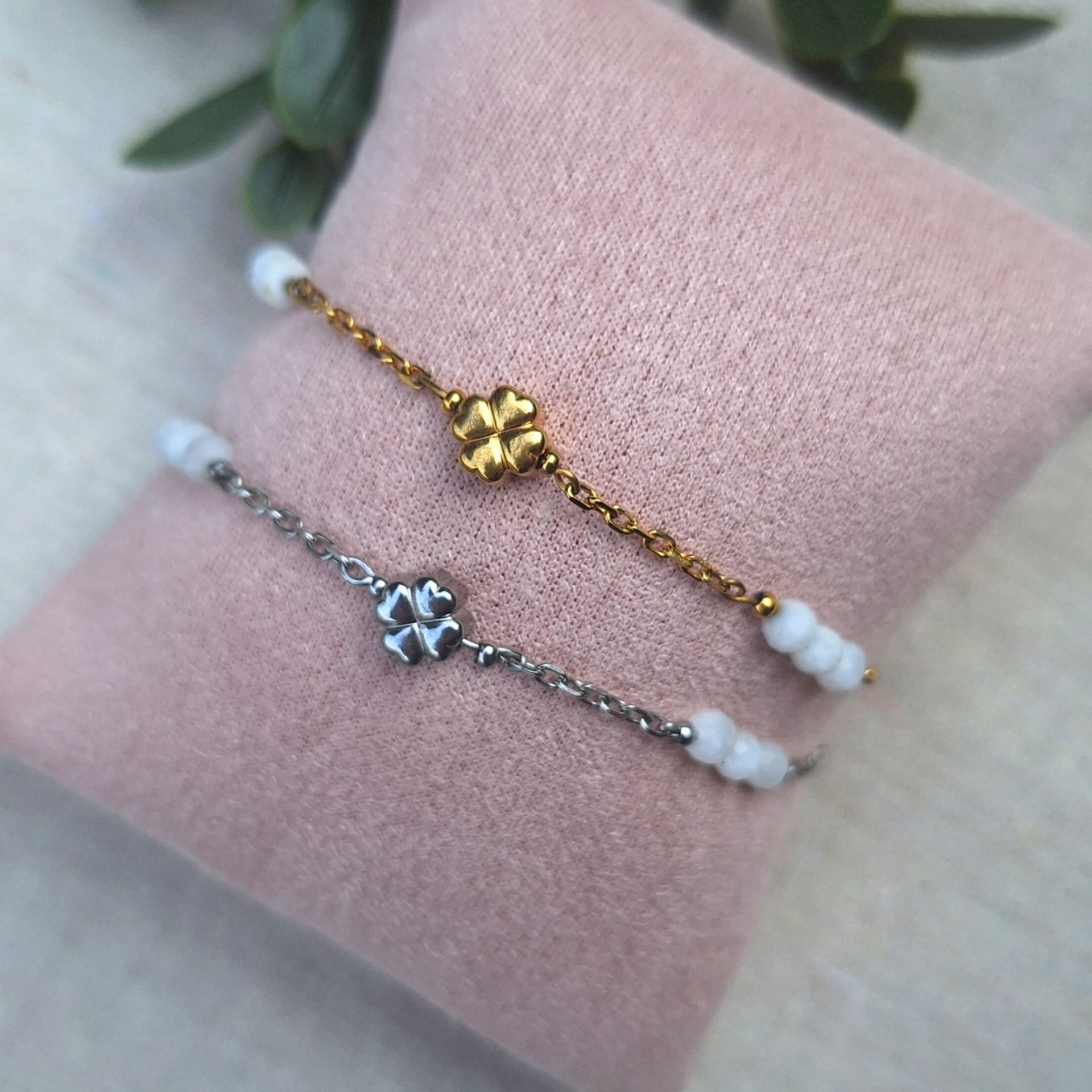 Een liefdevolle armband voor aanstaande moeders. In het midden een hartje of een klavertje 4, omringd door zes roze maanstenen, die bekend staan om hun rustgevende werking en vrouwelijke energie.
